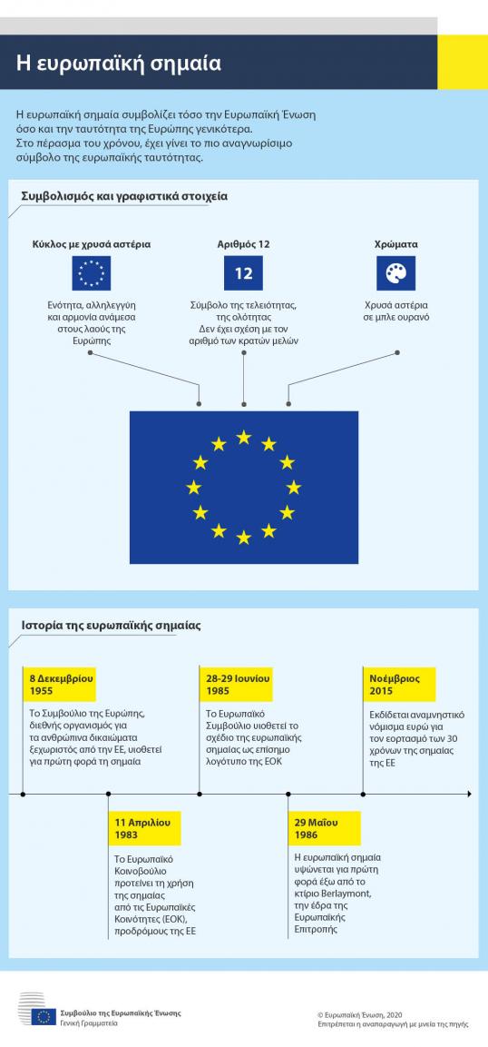 Συμπληρώνονται 40 χρόνια από τότε που η ΕΕ υιοθέτησε τη σημαία ως επίσημο έμβλημά της. Πλέον αυτή η σημαία εκφράζει τις προσδοκίες εκατομμυρίων Ευρωπαίων για μια ήπειρο ενωμένη με ειρήνη, ευημερία και σεβασμό της ανθρώπινης αξιοπρέπειας.