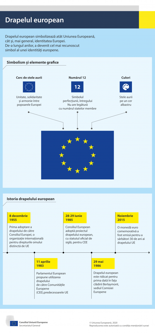 Înfățișează un cerc format din 12 stele aurii pe fond albastru. Acestea simbolizează idealurile de unitate, solidaritate și armonie între popoarele Europei.